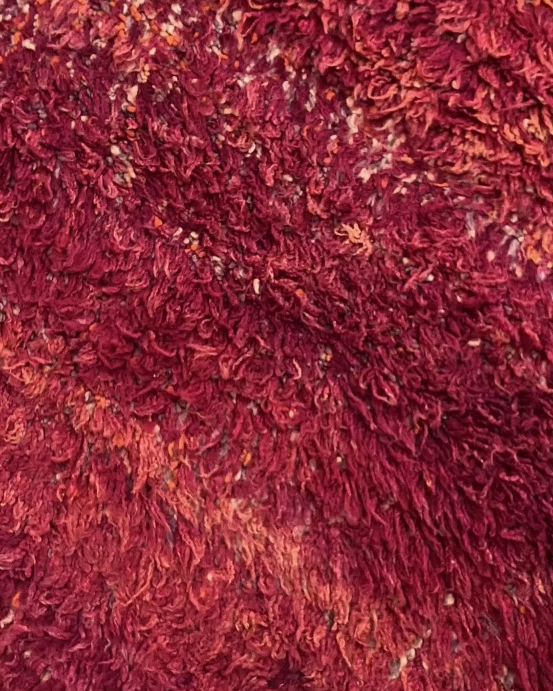 Mennun has a warm bordeaux red base with gradations of muted purple and warm terracotta. The hidden pattern has muted indigo blue and hints of white in it. It's an intricate warm-colored rug in beautiful condition